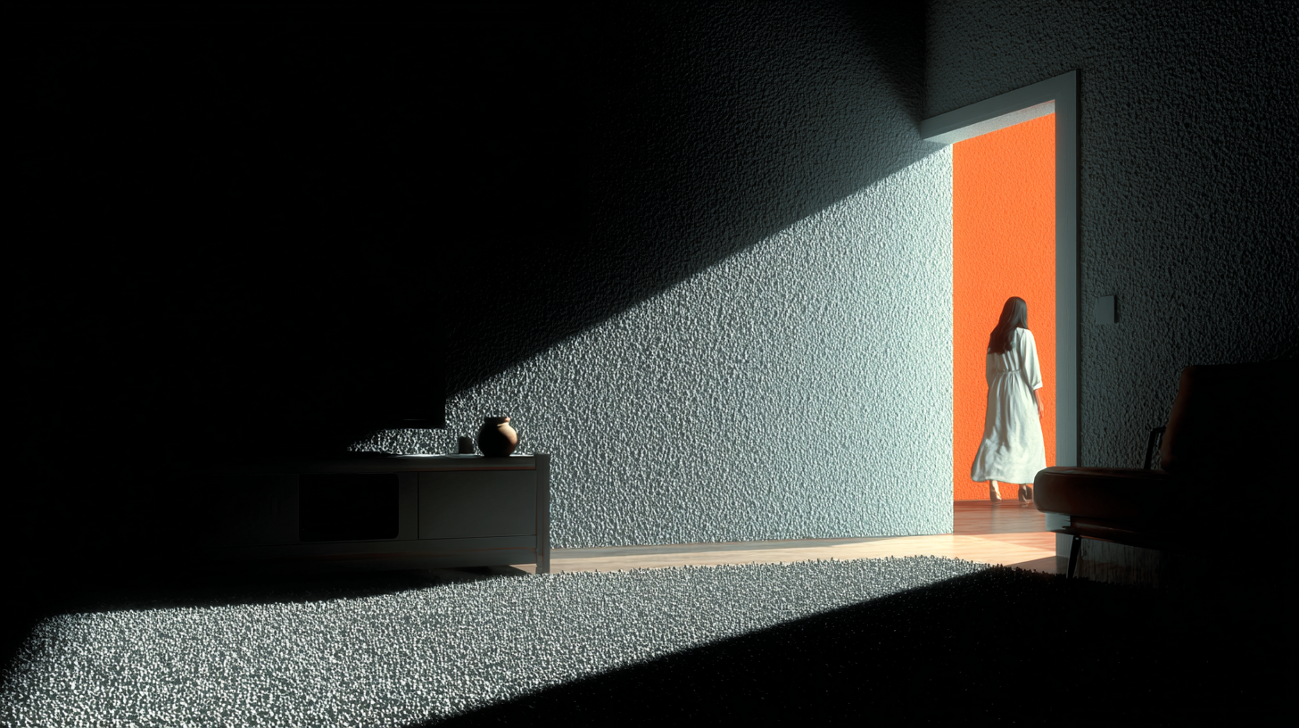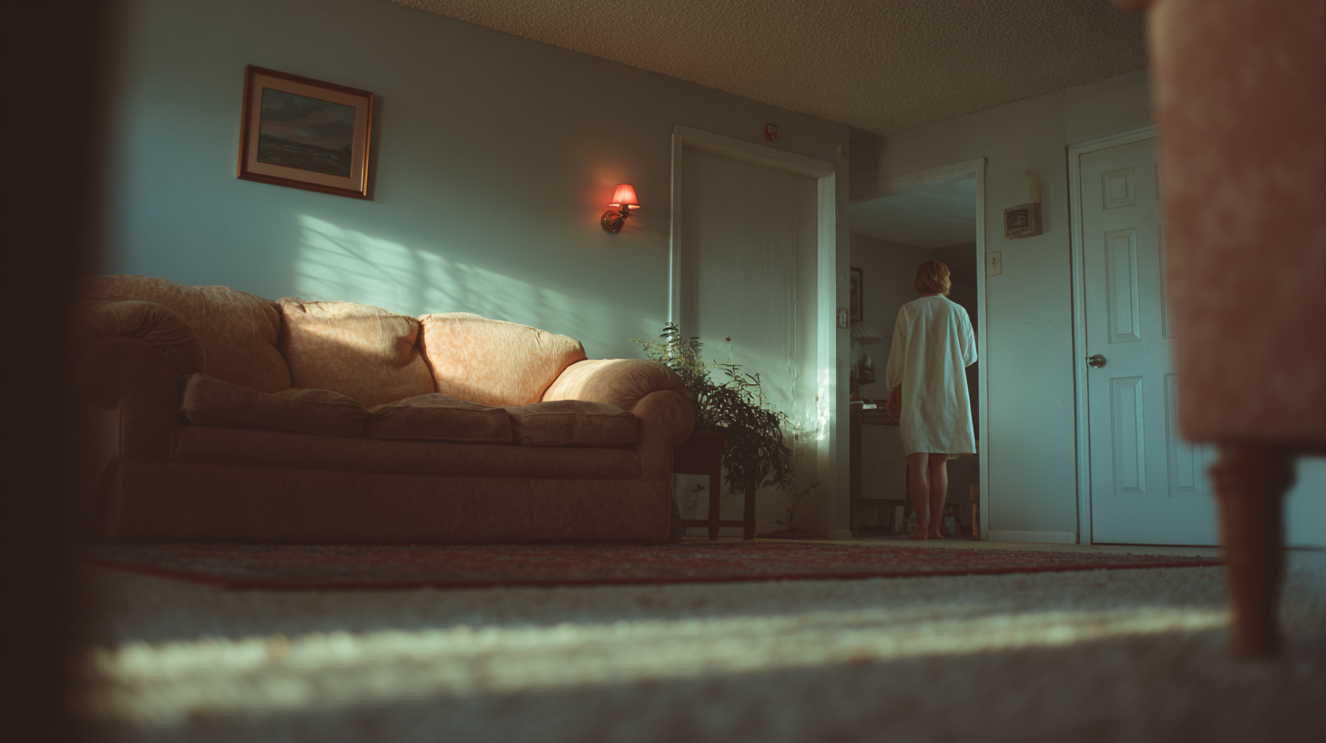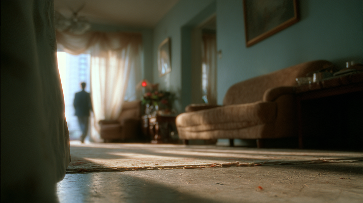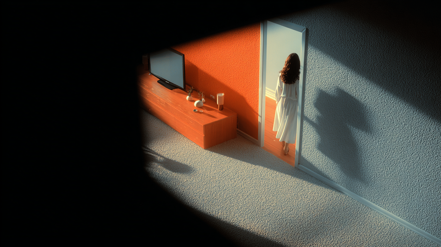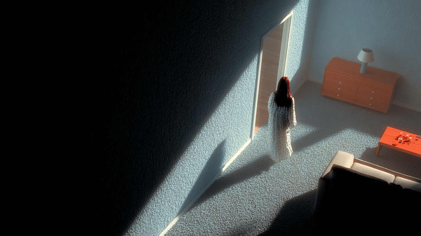 Consistent hyper-realistic rendering. Simona's face is shown to anchor emotion, while Boris remains an unseen, looming presence.