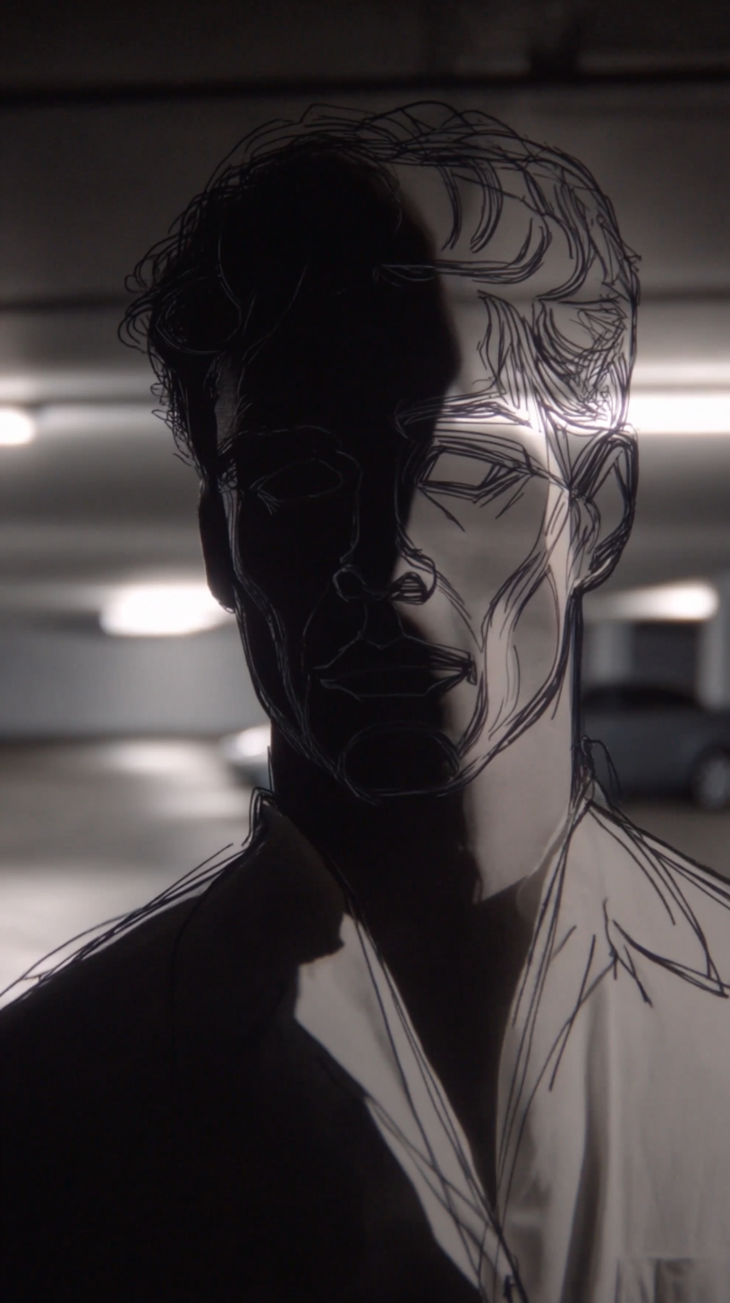 Begins with vibrant color animation, gradually desaturating into high-contrast realistic B&W as the drama intensifies.